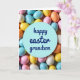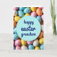 This design shows an overhead view packed edge to edge with smooth, egg-shaped candies that look freshly polished, like a sweet spring spread meant to be shared. Soft pastel tones—sky blue, lemon yellow, blush pink, apricot orange, and creamy white—sit close together, creating a cozy, friendly closeness in the way the colors mingle 🌷. The rounded surfaces catch the light with a gentle shine, giving the whole scene a tender, cared-for look. In the middle, a calm circular badge in light turquoise creates a quiet space amid the busy candy background. Centered on that circle is the message “happy easter grandson,” written in dark blue, flowing handwriting-style lettering. The dark blue text stands out clearly against the turquoise, like a note placed carefully where it can’t be missed, with the surrounding candies forming a cheerful frame 🐇. The final look is a turquoise circle at center, surrounded by tightly packed pastel eggs filling the entire background.
