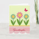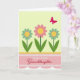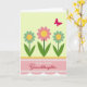 This card features a calm pale yellow-green background that feels like early spring, with three stylized flowers standing together like close friends 🌷. Two matching blooms sit on the left and right with rounded teal petals and sunny yellow centers, while the middle flower adds a gentle romantic touch with soft pink petals around its yellow center. The flowers rise on slim green stems, and broad green leaves at the base make them look grounded and steady, as if leaning in toward one another. In the upper right, a magenta butterfly hovers nearby 🐇, adding a lively contrast that suggests a sweet, fluttery moment. Across the lower third, a soft pink horizontal band stretches from side to side, edged with fine white lace-like borders. The greeting text sits inside this band, with “Happy Easter” in a simple dark lettering and “Granddaughter” in a flowing darker style placed beside or just below it. The lace edge shows tiny repeating loops and petal-like cutouts along the top and bottom of the pink band.