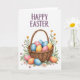 This design shows a rustic woven basket in natural brown, filled with softly glowing egg shapes in gentle blues, sunny yellows, tender pinks, and warm oranges. Around the basket, leafy green sprigs and small blossoms in pink, yellow, and lavender curl inward as if leaning close together, like friends sharing a quiet moment 🌷. The arrangement feels affectionate through its close spacing and the way the flowers seem to “gather” around the basket rather than sit apart. “HAPPY EASTER” appears above the illustration, centered near the top in plum-colored lettering that stands out against the white space. The white background keeps the focus on the basket and the pastel colors, giving everything a light, airy look. Subtle shading and watercolor-like edges soften the eggs and petals, adding a gentle, romantic touch without overpowering the scene 🐰. The basket sits near the lower center, framed by foliage on both sides, with a few blossoms pointing upward toward the plum text.