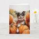Este cartão apresenta um retrato aquoso de um cão pastor australiano sentado numa pilha de abóboras num sistema de abóbora.