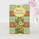 Fitas de retalhos de gingham verde floral e laranja em ambos os lados de um bando de flores bonito em amarelo e branco, com uma etiqueta dizendo "Parabéns" pendurada no topo. Um cartão de aniversário de aparência nova e feliz, estilo country, para todas as idades. Personalize o dentro com seu próprio texto!