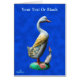 Pato de madeira pintado e esculpido com seu patinho, fortemente curado, sobre fundo azul. Adicione seu próprio texto.