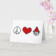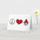 Apresenta um desenho animado divertido de um sinal de paz, um coração vermelho e um gnomo com um chapéu vermelho.