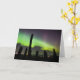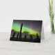 Um cartão com uma foto das pedras eretas de Callanish na ilha de Lewis, Scotland. Mostrando uma tira vívida da Aurora verde ativa Borealis/aurora boreal, com as colunas verdes e roxas mais claras.
