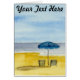 Uma simples paisagem aquática de cadeiras de praia acolhedoras e guarda-chuva de praia ao lado do mar. Personalize mudando o texto para se adequar!