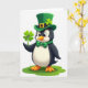 This card shows a chubby penguin standing in the center on a small patch of green grass, set against a plain white background that keeps all eyes on the character 💚. It wears a tall emerald leprechaun hat with a shamrock on the front and a band with a gold buckle, plus a matching green bow tie snug at its neck. The penguin’s big eyes and lightly blushed cheeks give it a tender, friendly look, like it’s posing for someone it really likes. In its left flipper, it holds a three-leaf clover with the word “Luck” printed across it in dark lettering, easy to read at a glance ☘️. The penguin’s feathers are deep black with soft highlights, and its belly is bright white, creating a gentle contrast that feels cozy and close. Its beak and webbed feet are a warm orange, adding a sunny pop of color near the bottom of the design. The grass beneath it curves in small waves and is dotted with tiny new leaves, with the penguin standing squarely above the green patch.