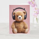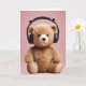 Urso castanho-bonito vestindo fones de ouvido em fundo rosa para pensar em você