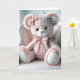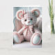 Um ursinho de pelúcia pincelado com um padrão de gingham rosa e branco sentado numa cadeira branca e elegante, enfeitada com um arco e pequenas flores no seu ouvido. O texto pode ser alterado.