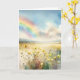 Uma paisagem serena apresenta um arco-íris vibrante que passa sobre um campo de flores silvestres com montanhas ao fundo. O texto do dentro pode ser alterado.