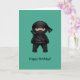 O adorável chubby, mas assustador, pequeno ninja está vestido de roupa preta e carregando katana - espada tradicional japonesa.