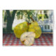 As peras suculentas sentam-se na mesa piquenique sob a sombra vestida de uma árvore. O original é uma pintura em miniatura de óleo por Kathie Miller
