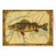 Esta impressão ilustra um quadro artístico de um peixe-perca amarelo. O plano de fundo exibe um mapa geográfico antigo em cores bege claro. A estrutura marrom se assemelha a um padrão antigo de madeira com flores amarelas-vermelhas nas bordas. Um excelente extra para a sua coleção de pesca!