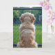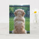 Um cão golden retriever senta-se de frente para uma cerca de arame, olhando para um quintal verde exuberante.