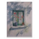 Pintura da Aquarela de gerânio potted no windowsill, pétalas que caem. o sol está brilhando através de uma árvore próxima e está criando sombras bonitas na parede e na janela e está seleccionando o teste padrão das cortinas líquidas.