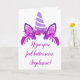 Conhece alguém que não está se sentindo como seu ser mágico habitual? Envie-lhes alguns pensamentos curativos com este cartão bonito. Apresenta uma ilustração de um chifre unicórnio e orelhas com sotaque floral em tons de roxo, magenta, lavanda e rosa. A mensagem get well na frente e a dentro deste cartão de saudação está pronta para você personalizá-la com sua própria saudação personalizada.