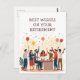 Celebrar a aposentadoria de um colega com este cartão de despedida personalizado com uma ilustração encantadora de colegas de trabalho a despedir-se. O design inclui o texto editável "Melhores Desejos na Reforma", que pode ser personalizado com o nome do aposentado ou a mensagem pessoal. Perfeito para despedidas no escritório, celebrações no local de trabalho e festas de aposentadoria, esta carta única combina calor, humor e estilo profissional para tornar seu envio extra especial.