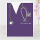 Cartão de graduação de uma escola médica criativa com esfregões de hospital roxos com um belo canivete suíço no bolso. Personalizar texto de edição para adicionar nome de médico, cirurgião ou assistente médico.