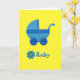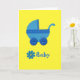 Carruagem de bebê azul cortada à mão com fita azul e botões azuis colados nas rodas, lindos fundos amarelos brilhantes e flores azuis primavera para o parto do bebê no cartão. *Todas as coisas que você vê nos produtos são feitas à mão, mas você deve saber que você consegue uma foto!
