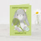 Cartão de aniversário de coelhinho de tênis verde super fofo para tênis player. Estilo 2. O fundo com belos pacotes de tênis também está disponível como tecido e muitos itens de temas do dia a dia e do tênis. O texto da 3ª página é totalmente personalizável. Tudo que precisa é assinar na base e o único cartão de aniversário está pronto para fazer alguém sorrir. O texto na última página também é personalizável ou você pode excluí-lo e deixá-lo vazio.