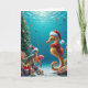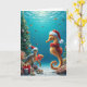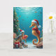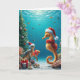 Submarino, cavalo marinho e tartaruga marinha vestem chapéus de Papai Noel cercados por peixes-palhaço e recifes de corais decorados com ornamentos festivos. Todo o texto pode ser alterado.