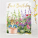 Peter o Coelho em sua pequena jaqueta azul sentada em um pote de uma planta de terracota em seu jardim.