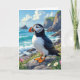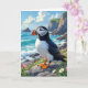 Um aniversário engraçado com piada de puffin. Uma bela ilustração vibrante e colorida de um puffin observando as ondas do oceano pela costa do mar cercada por rochas, dunas e flores.