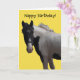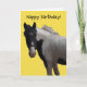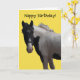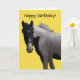 Imagem fotográfica adorável de um pônei preto e branco, cor-de-rosa, num fundo amarelo brilhante. A mensagem na frente da placa e do dentro pode ser alterada para uma mensagem de sua escolha, se desejar. Todo texto é definido como modelo para sua conveniência.
