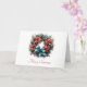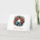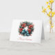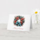 Cartão de Natal com bonito coroa de Natal. Uma imagem festiva com um pínus corado com flores vermelhas, holly e um adorável arco azul. Que encantador.