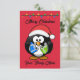 Cartão Pinguim de fundo vermelho segurando presentes de N