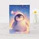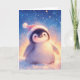 Um pinguim bebê fofo fica alegremente na neve, vestindo um chapéu vermelho e festivo de Papai Noel com um jato branco de pelo. As características suaves e redondas do pinguim e as bochechas rosadas irradiam calor contra o pano de fundo legal do inverno. Luzes brilhantes e flocos de neve suavemente caindo criam uma atmosfera mágica, iluminando a cena com matizes ouros e azuis. Os olhos brilhantes e brilhantes do pinguim e o sorriso gentil capturam o espírito da época de férias, fazer esta uma ilustração de inverno emocionante.