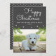 Pinheiro de Natal bonito lança Cartão com fotos de Cachorro Neve Floco de Neve. Cartão com fotos bonito de cachorro de Natal com galhos de árvores de Natal. O fundo é cinza escura com flocos de neve brancos e o texto está em um roteiro branco moderno. Adicione sua foto e personalize a mensagem na frente.