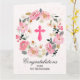 Uma elegante cruz cor-de-rosa cercada por uma coroa aquática de flores de jardim destaca esta carta religiosa de saudação. Perfeito para uma primeira comunhão, batismo ou batizar. Personalize o dentro ou saia como está. Itens CORRESPONDENTES disponíveis em nossa loja.
