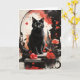 Retrato de gato preto em aquarela com respingos de arte e flores vermelhas em um fundo vermelho e preto. Cartão de cumprimentos em branco para aniversário, aniversário de casamento, novo bebê, agradecimento, condolências, etc.