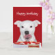 Um touro branco, terrier, lamber suas lábios em um bolo de aniversário... deseja que o destinatário tenha um feliz aniversário e proclama 'comer vamos', facilmente modificável, amantes de cachorro de texto ou amantes pitbull terrier