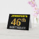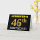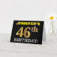 Este design de cartão de saudação de aniversário apresenta uma mensagem como "46º ANIVERSÁRIO DE JENNIFER!", com o "46º" a ter uma aparência falsa e imitada de cor dourada. O nome do destinatário na frente pode ser personalizado e o fundo frontal é preto colorido. Também apresenta uma mensagem de saudação de aniversário personalizada no dentro. Um cartão de aniversário como este talvez pudesse ser dado a alguém para celebrar o seu quarenta e sexto aniversário. [~Z0000183]