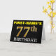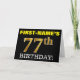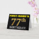 Este design de cartão de saudação de aniversário apresenta uma mensagem como "FIRST-NAME'S 77th BIRTHDAY!", com o "77º" a ter uma aparência falsa e imitada de cor dourada. O nome do destinatário na frente pode ser personalizado e o fundo frontal é preto colorido. Também apresenta uma mensagem de saudação de aniversário personalizável no dentro. Um cartão de cumprimentos de aniversário como este talvez pudesse ser dado a alguém em comemoração dos seus setenta e sete anos. [~Z0000183]