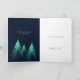 Um cartão de árvore de Natal brilhante projetado com raios verdes e faíscas e pequenas luzes azuis brancas na árvore. Sobre um fundo azul-escuro do céu e um grande e gracioso texto tipográfico branco "Feliz Natal". As árvores de Natal também brilham no cartão de dentro com sua mensagem pessoal e seus nomes. Um belo design de cartões de natal de Luckz.