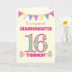 Uma carta de 16 de aniversário bonito para sua neta, com bunting de bolinhas, flores de primata e números cheios de padrão primata, todos em um fundo amarelo pálido de gingham. A mensagem principal do cobrir é: "Para uma avó 16 muito especial HOJE!" A mensagem dentro é apenas uma sugestão e você pode personalizá-la facilmente ou excluí-la se preferir.