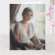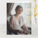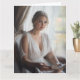 Este cartão de arte cativante apresenta um retrato sereno de aquarela de uma linda jovem loira, com um vestido branco de seda. Sentada por uma janela, ela segura um livro aberto e vira seu olhar envolvente em direção ao espectador. O estilo aquoso suave transmite lindamente a graça silenciosa e o encanto literário da cena. Esta carta é perfeita para enviar uma nota refletida, uma mensagem a um colega amante de livros, ou a qualquer pessoa que aprecie arte que captura momentos de conexão serena.