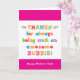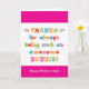 Você chama sua avó de Bubbie, não vovó. (Bubbie significa avó em iídiche.) Imaginem como a Bubbie ficará animada por receber um cartão de Dia de as mães endereçado especialmente a ela! O seu novato também vai adorar o design colorido baseado em texto que diz "Obrigados por ser sempre tão incrível como o Bubbie! Feliz Dia de as mães!" Torne este cartão personalizável! Clique em "Editar Design", "Dentro Inferior/Direita: Texto e imagens", "Texto" e "Adicionar texto" para escrever a sua própria mensagem personalizada e personalizada no dentro da Bubbie!