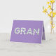 Placa de dia de as mães para Gran. Você chama sua avó de Gran, não vovó. Imaginem como Gran ficará animada em receber um cartão de Dia de as mães endereçado especialmente a ela! Sua avó também vai adorar o belo design floral deste cartão de Dia de as mães que diz "Gran" escrito em pequenas flores brancas na frente, com um fundo roxo, e "Happy Dia de as mães!" escrito em pequenas flores brancas no dentro. Torne este cartão personalizável! Clique em "Editar Design", "Dentro Inferior/Direita: Texto e imagens", "Texto" e "Adicionar texto" para escrever a sua própria mensagem personalizada e personalizada no Gran dentro!