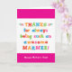 Você chama sua avó Marmee, não vovó. Imagine como Marmee ficará animada ao receber um cartão de Dia de as mães endereçado especialmente a ela! O seu marmee também vai adorar a divertida e colorida design baseada em texto que diz "Obrigados por ser sempre um Marmee incrível! Feliz Dia de as mães!" Torne este cartão personalizável! Clique em "Editar Design", "Dentro Inferior/Direito: Texto e imagens", "Texto" e "Adicionar texto" para escrever a sua própria mensagem personalizada e personalizada em Marmee dentro!