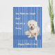Cartão de dia de os pais do cão de estimação. O cachorro no cartão é todo branco e tem um sorriso no rosto. O fundo é de faixas azuis e azuis mais claras. Obrigados para Creative Fabrica para o design do fundo.