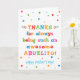 Você chama seu avô de Abuelito, não vovô. (Abuelito significa avô em espanhol.) Imaginem como Abuelito ficará entusiasmado por receber um cartão de Dia de os pais endereçado especialmente a ele! Seu abuelito também vai adorar o design brilhante e colorido desta carta que diz "Obrigados por ser sempre um incrível Abuelito! Feliz Dia de os pais!" Torne este cartão personalizável! Clique em "Editar Design", "Dentro Inferior/Direito: Texto e imagens", "Texto" e "Adicionar texto" para escrever a sua própria mensagem personalizada e personalizada em Abuelito dentro!