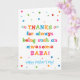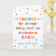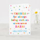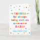 Você chama seu pai de Baba, não de Pai. (Baba significa pai em Bangla / Bengali, Farsi, Urdu, Mandarin Chinês, Turco, Marathi, Welsh, Kiswahili / Swahili, Albanês, & Luo.) Imagine como Baba ficará animada em receber um cartão de Dia de os pais endereçado especialmente a ele! Sua baba também vai adorar o design brilhante e colorido desta carta que diz "Obrigados por ser sempre uma Baba incrível! Feliz Dia de os pais!" Torne este cartão personalizável! Clique em "Editar Design", "Dentro Inferior/Direita: Texto e imagens", "Texto" e "Adicionar texto" para escrever a sua própria mensagem personalizada e personalizada no dentro Baba!