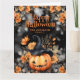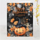 Feliz cartão de Dia das Bruxas com uma abóbora sorridente adornada com flores laranja. Um fantasma com um dentro de jack-o-lanterno. Personalize facilmente este cartão de Dia das Bruxas fofo com o seu nome e texto da família.