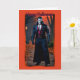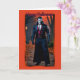 Esta ousada carta do Dia das Bruxas apresenta uma imagem impressionante de um vampiro clássico, exuberando uma presença poderosa e sinistra. Vestido num elegante casaco preto com um colar alto, um colar vermelho profundo, e luvas pretas, este vampiro encarna o alento do eterno e o perigo associado à lendária criatura. O seu olhar intenso e a sua postura formidável são colocados contra um fundo sombrio e inquietante, somando-se à atmosfera arrepiante do cartão.