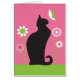 Um cartão de nota de vazio com uma ilustração original da Mango Moon de um gato preto observando uma borboleta entre flores brancas.