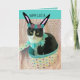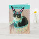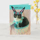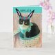 Esta Páscoa engraçada de gato apresenta um gato de smoking com orelhas de coelho sentados em uma caixa em forma de ovo. Uma coroa de flores aparece ao redor da cabeça do gatinho e ao redor do pescoço do gatinho. Dentro a design apresenta um verso engraçado que fará o receptor sorrir. Copyright alcança o gato Tuxedo
