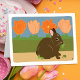 Este coelho fofo é culpado de comer as plantas do jardim. Coelho castanho em frente à cobertura verde com tulipas e céu ao fundo. A imagem parece papel pintado à mão. Use para Equinox Primavera, equinócio de março, o primeiro dia de primavera, Páscoa, equinócio Vernal e Terra-mãe. Castanho, pêssego, verde, marrom e rosa. Dentro: Primavera feliz